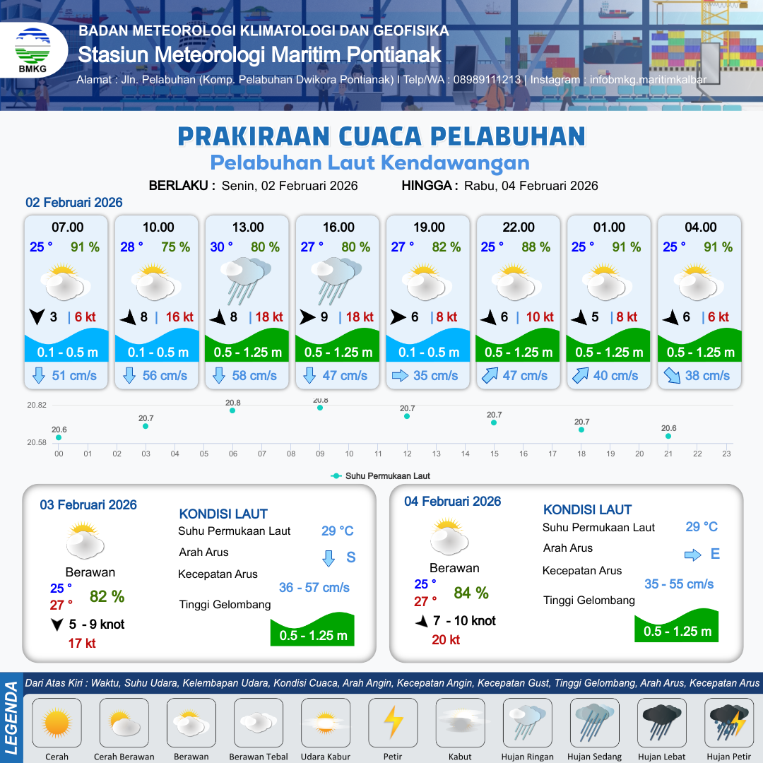 2 Feb 26, 23.00 4 jam kedepan | Cerah Berawan | Utara 5 kt Gust Peningkatan kecepatan angin yang singkat dan tiba-tiba : 6 kt | | | 10 km | 25 °C | 92 % | +0.38 m |