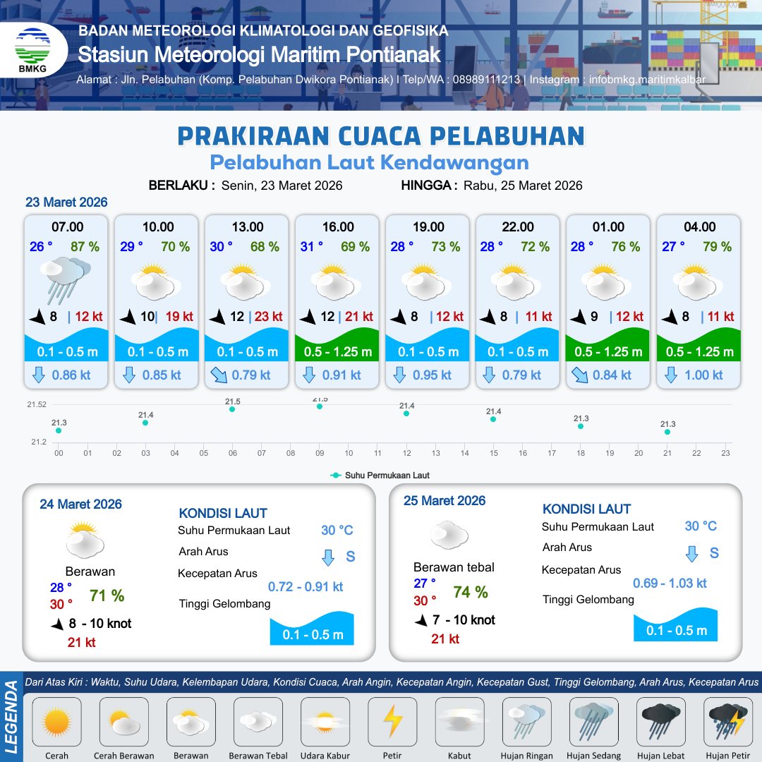 23 Mar 26, 04.00 14 jam yang lalu | Berawan | Barat Laut 10 kt Gust Peningkatan kecepatan angin yang singkat dan tiba-tiba : 21 kt | | | 8 km | 30 °C | 69 % | -0.36 m |