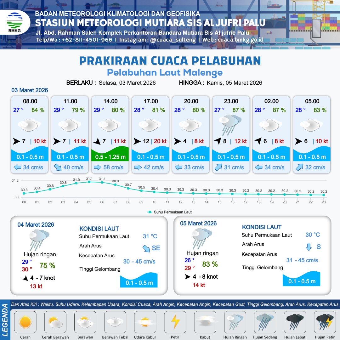 3 Mar 26, 09.00 9 jam yang lalu | Berawan Tebal | Barat 12 kt Gust Peningkatan kecepatan angin yang singkat dan tiba-tiba : 20 kt | | | 9 km | 28 °C | 81 % | +0.64 m |