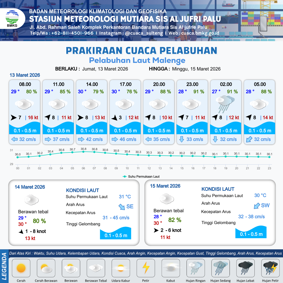 13 Mar 26, 06.00 12 jam yang lalu | Berawan Tebal | Barat 8 kt Gust Peningkatan kecepatan angin yang singkat dan tiba-tiba : 13 kt | | | 10 km | 30 °C | 79 % | +0.06 m |