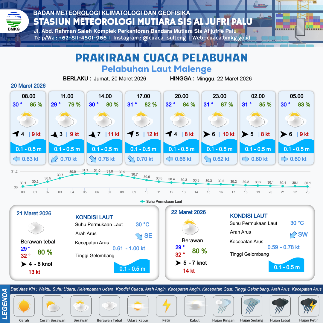 19 Mar 26, 23.00 3 jam kedepan | Berawan Tebal | Barat 7 kt Gust Peningkatan kecepatan angin yang singkat dan tiba-tiba : 8 kt | | | 10 km | 26 °C | 84 % | +0.40 m |
