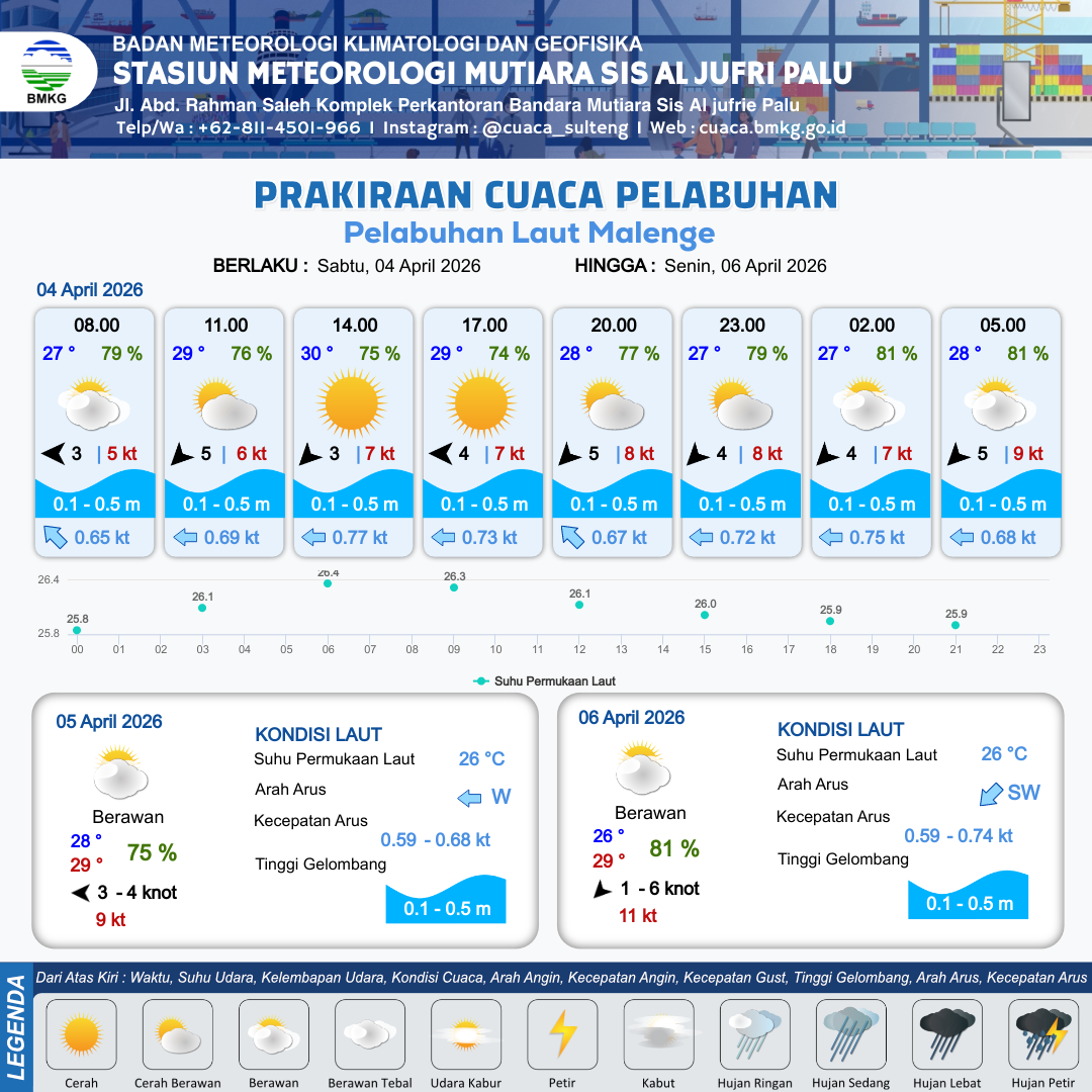 4 Apr 26, 03.00 16 jam yang lalu | Cerah Berawan | Timur Laut 5 kt Gust Peningkatan kecepatan angin yang singkat dan tiba-tiba : 6 kt | | | 10 km | 29 °C | 76 % | +0.60 m |
