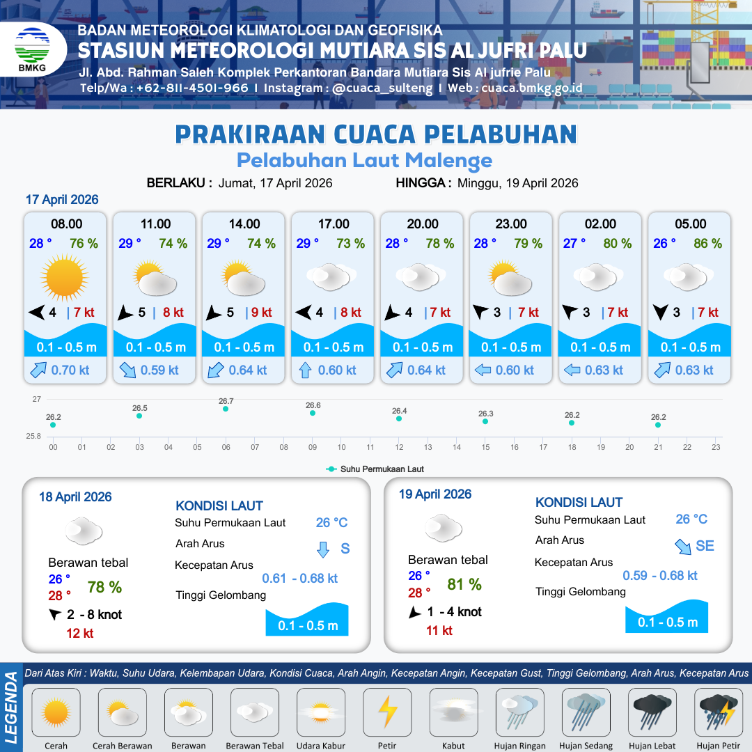 17 Apr 26, 17.00 8 jam kedepan | Tenggara 3 kt Gust Peningkatan kecepatan angin yang singkat dan tiba-tiba : 7 kt | 0.3 m Tenang | Barat 0.6 Knot | 10 km | 28 °C | 79 % | +0.63 m | |