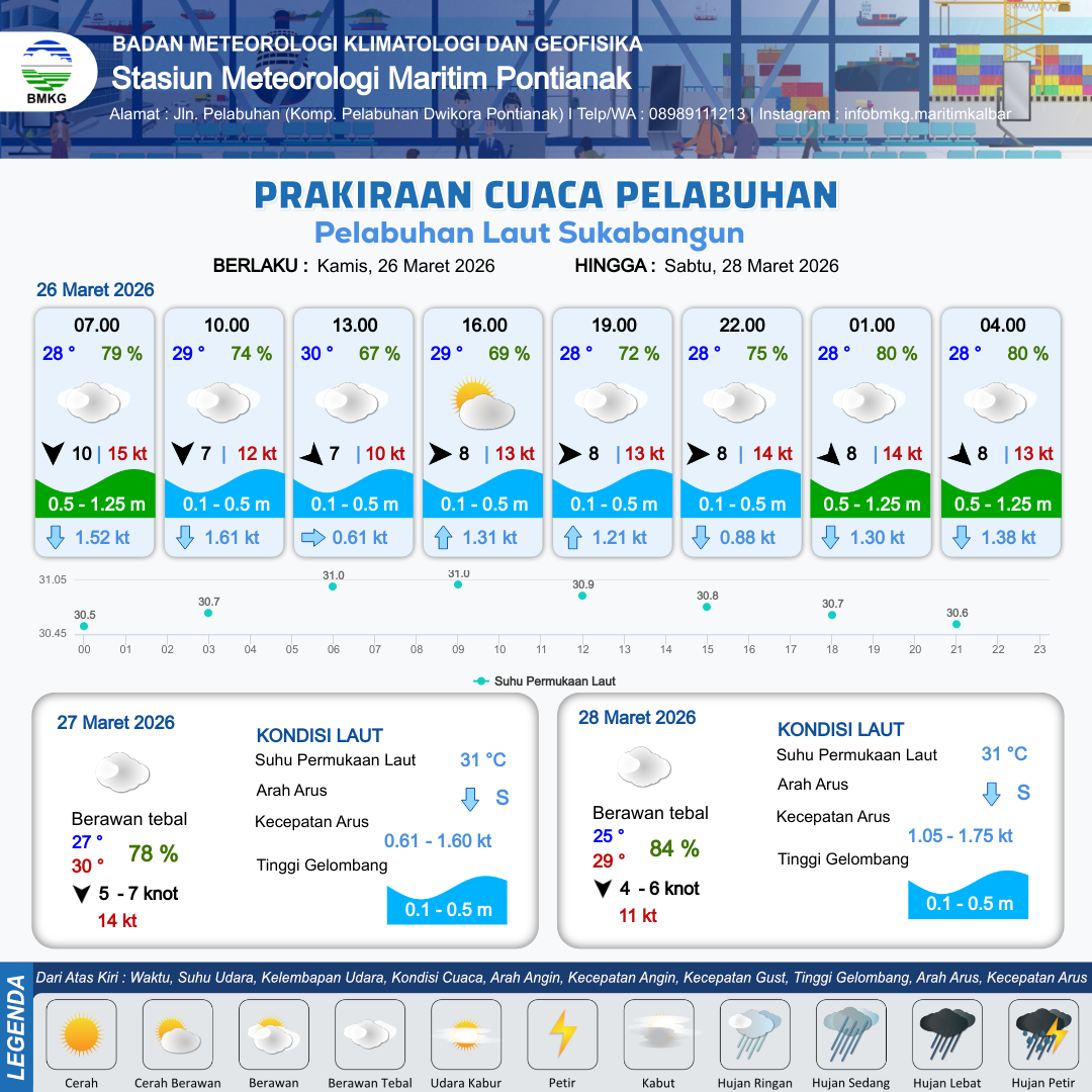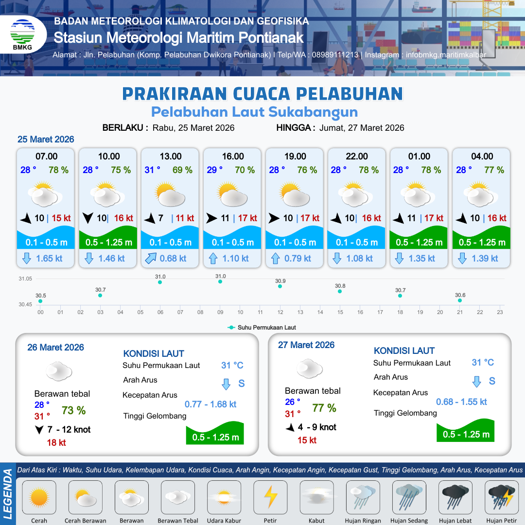 25 Mar 26, 11.00 2 jam kedepan | Barat 10 kt Gust Peningkatan kecepatan angin yang singkat dan tiba-tiba : 17 kt | 0.4 m Tenang | Utara 1.0 Knot | 10 km | 28 °C | 75 % | +0.27 m | |