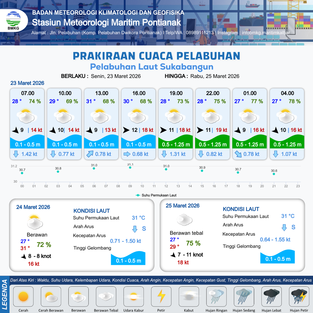23 Mar 26, 13.00 3 jam kedepan | Barat 11 kt Gust Peningkatan kecepatan angin yang singkat dan tiba-tiba : 18 kt | 0.6 m Rendah | Selatan 1.1 Knot | 8 km | 28 °C | 74 % | -0.06 m | |