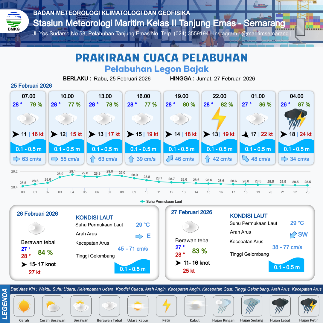 25 Feb 26, 23.00 5 jam kedepan | Berawan Tebal | Barat 17 kt Gust Peningkatan kecepatan angin yang singkat dan tiba-tiba : 27 kt | | | 8 km | 27 °C | 85 % | -0.13 m |