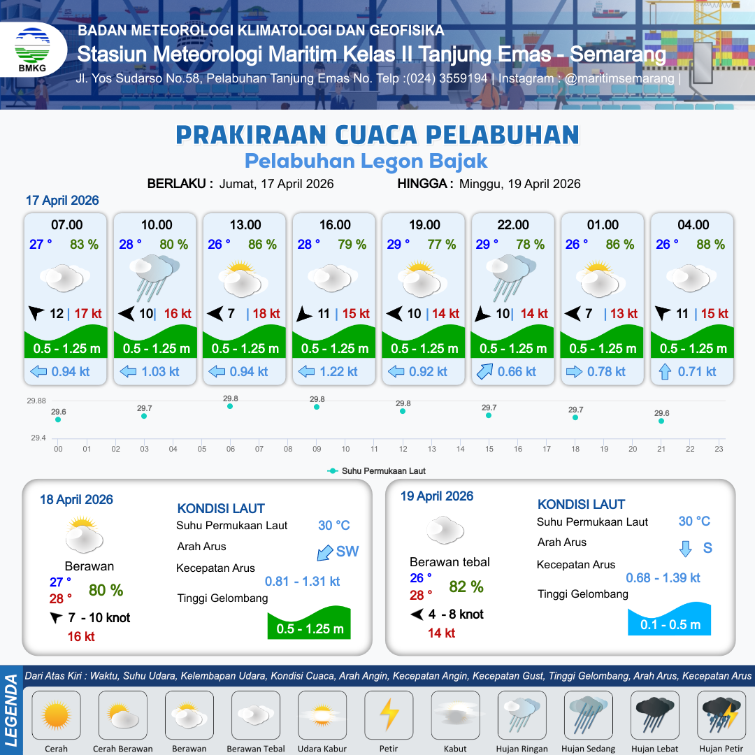 17 Apr 26, 23.00 5 jam kedepan | Berawan Tebal | Tenggara 10 kt Gust Peningkatan kecepatan angin yang singkat dan tiba-tiba : 14 kt | | | 7 km | 27 °C | 83 % | +0.60 m |
