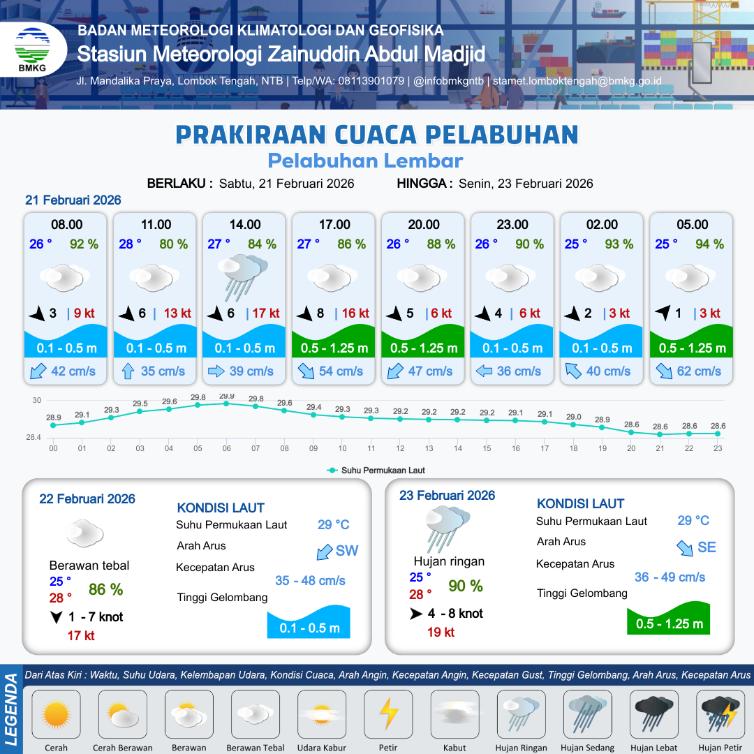 21 Feb 26, 20.00 2 jam kedepan | Berawan Tebal | Barat Daya 1 kt Gust Peningkatan kecepatan angin yang singkat dan tiba-tiba : 4 kt | | | 10 km | 25 °C | 94 % | +0.11 m |