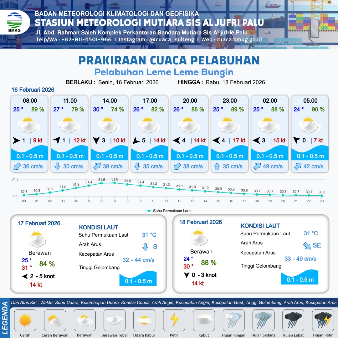 16 Feb 26, 23.00 18 jam kedepan | Barat Laut 2 kt Gust Peningkatan kecepatan angin yang singkat dan tiba-tiba : 5 kt | 0.1 m Tenang | Barat Laut 32.0 cm/s | 10 km | 25 °C | 91 % | -0.62 m |