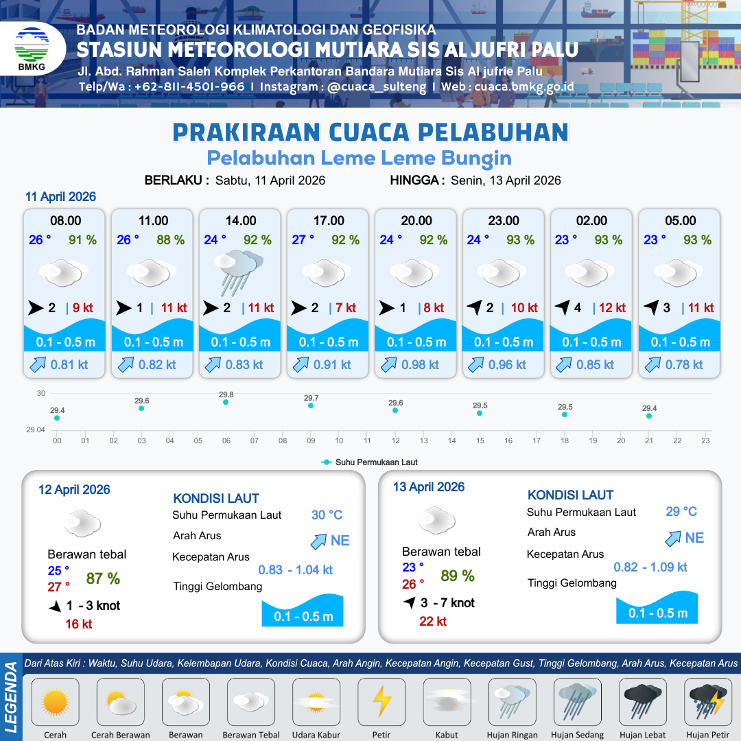 11 Apr 26, 23.00 14 jam kedepan | Barat Daya 3 kt Gust Peningkatan kecepatan angin yang singkat dan tiba-tiba : 10 kt | 0.4 m Tenang | Timur Laut 0.8 Knot | 10 km | 24 °C | 92 % | +0.66 m |