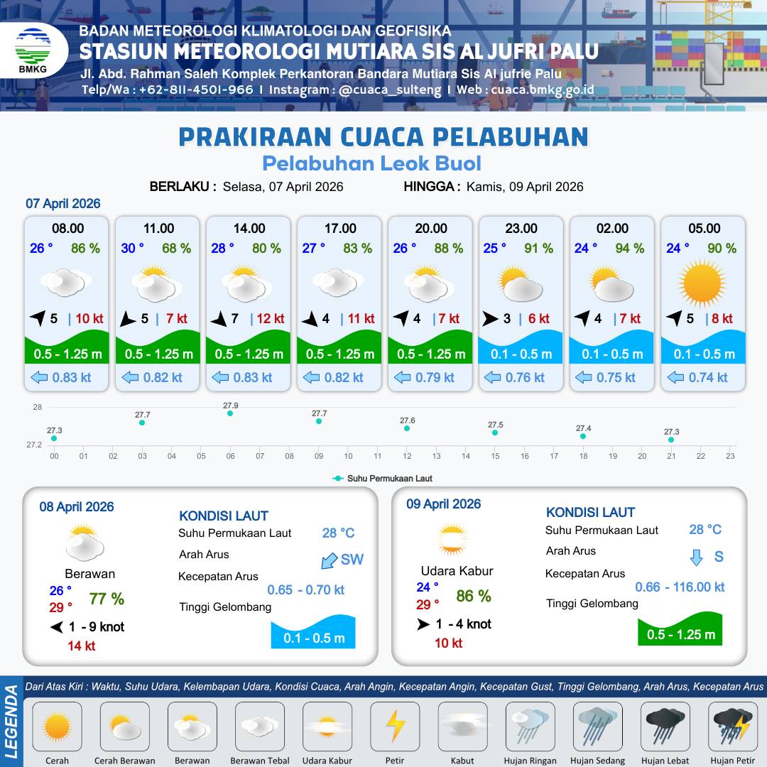 7 Apr 26, 23.00 15 jam kedepan | Barat Daya 4 kt Gust Peningkatan kecepatan angin yang singkat dan tiba-tiba : 9 kt | 0.5 m Rendah | Barat 0.7 Knot | 10 km | 25 °C | 82 % | +0.62 m |