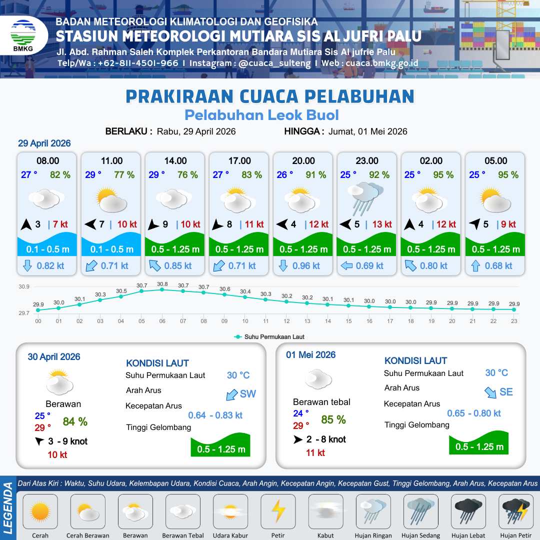 29 Apr 26, 06.00 4 jam kedepan | Timur Laut 9 kt Gust Peningkatan kecepatan angin yang singkat dan tiba-tiba : 10 kt | 0.6 m Rendah | Barat Laut 0.8 Knot | 9 km | 29 °C | 76 % | -0.03 m | |
