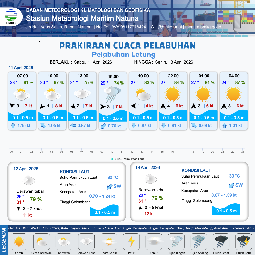 11 Apr 26, 10.00 10 jam yang lalu | Cerah Berawan | Barat 3 kt Gust Peningkatan kecepatan angin yang singkat dan tiba-tiba : 7 kt | | | 10 km | 28 °C | 77 % | +0.59 m |