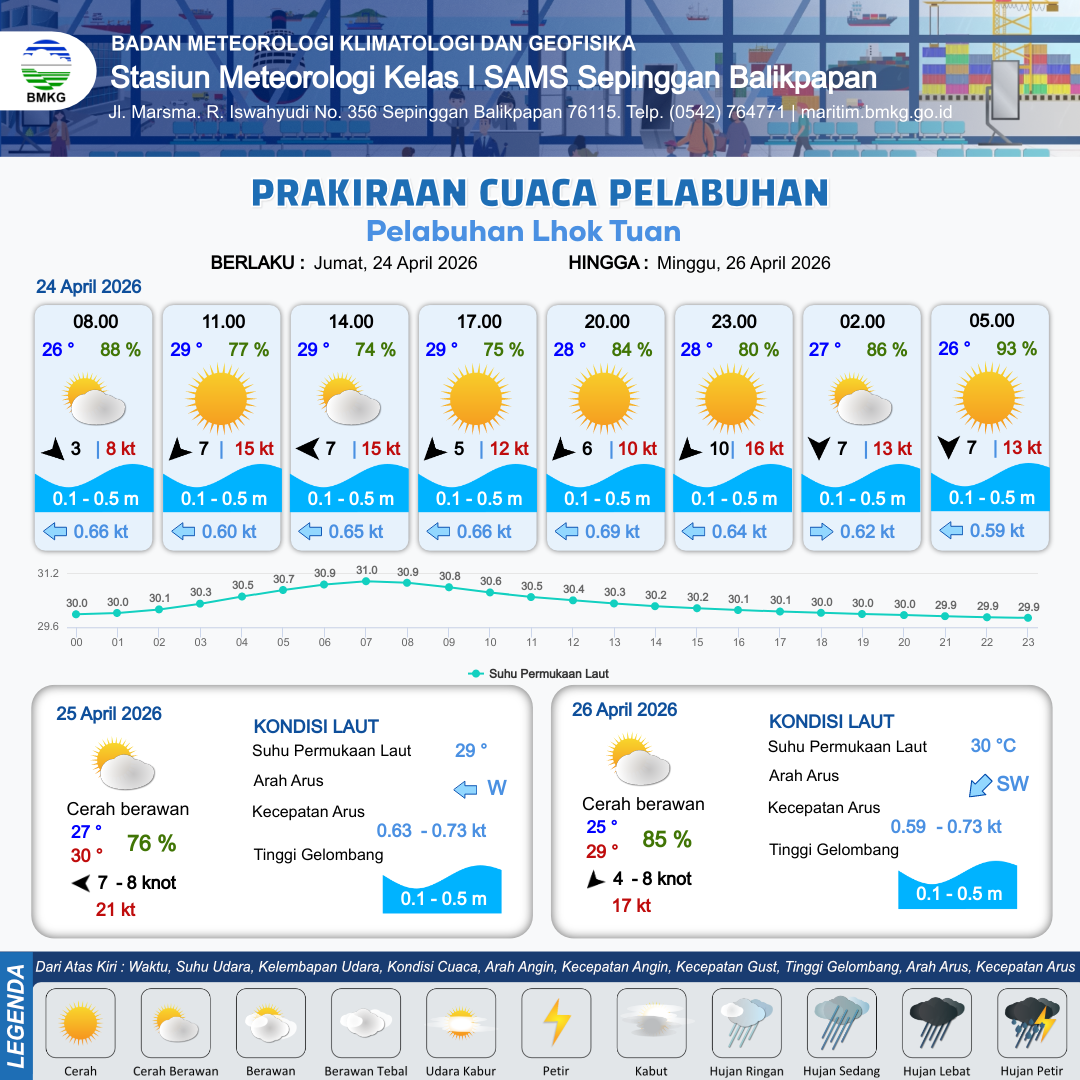 23 Apr 26, 04.00 15 jam yang lalu | Cerah Berawan | Timur Laut 5 kt Gust Peningkatan kecepatan angin yang singkat dan tiba-tiba : 13 kt | | | 10 km | 29 °C | 78 % | +0.13 m |