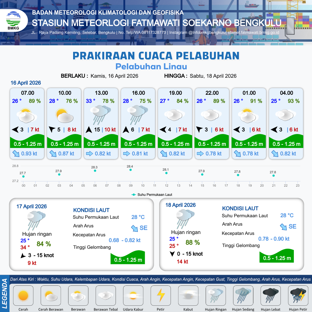16 Apr 26, 00.00 3 jam kedepan | Barat Laut 1 kt Gust Peningkatan kecepatan angin yang singkat dan tiba-tiba : 9 kt | 1.2 m Rendah | Tenggara 1.0 Knot | 8 km | 25 °C | 95 % | +0.52 m |