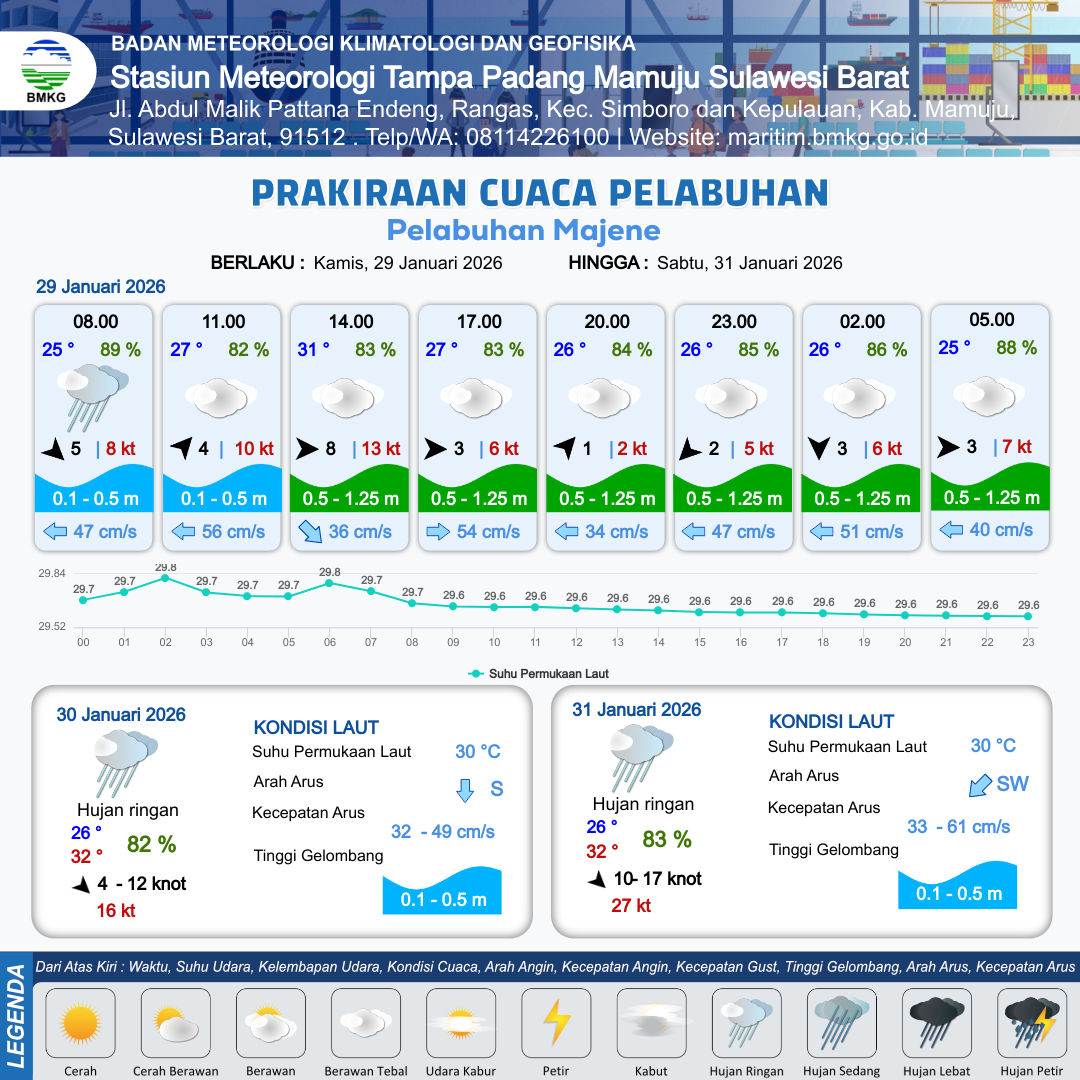 29 Jan 26, 05.00 14 jam yang lalu | Berawan Tebal | Barat 8 kt Gust Peningkatan kecepatan angin yang singkat dan tiba-tiba : 15 kt | | | 7 km | 30 °C | 83 % | +0.31 m |