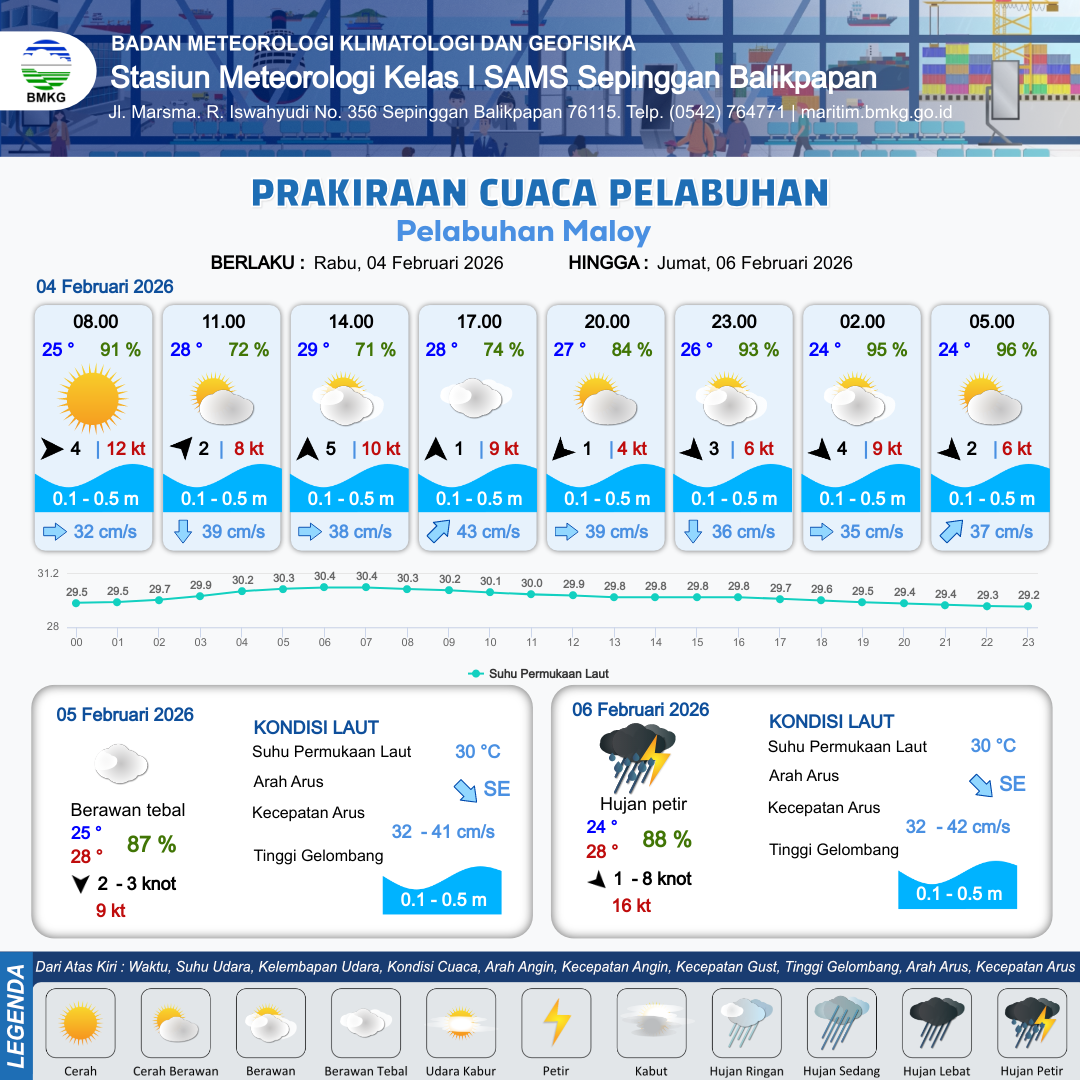 4 Feb 26, 13.00 4 jam kedepan | Timur Laut 1 kt Gust Peningkatan kecepatan angin yang singkat dan tiba-tiba : 4 kt | 0.2 m Tenang | Timur Laut 36.0 cm/s | 10 km | 27 °C | 86 % | +0.75 m | |