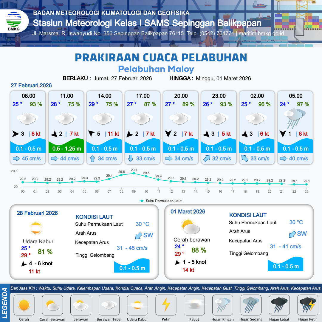 28 Feb 26, 21.00 4 jam kedepan | Utara 5 kt Gust Peningkatan kecepatan angin yang singkat dan tiba-tiba : 8 kt | 0.1 m Tenang | Barat 33.0 cm/s | 10 km | 24 °C | 95 % | +0.02 m | |