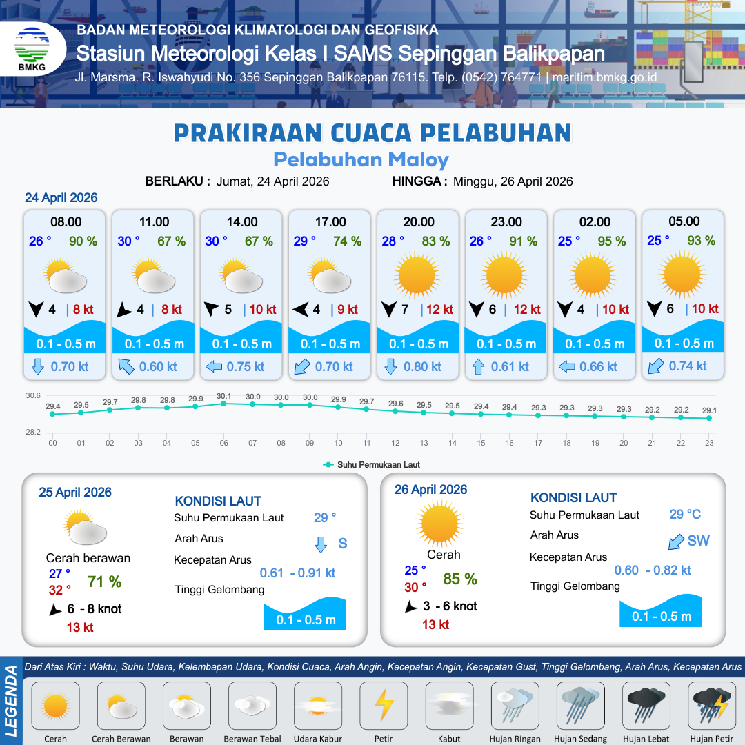 23 Apr 26, 06.00 16 jam kedepan | Timur 5 kt Gust Peningkatan kecepatan angin yang singkat dan tiba-tiba : 9 kt | 0.1 m Tenang | Barat Laut 0.8 Knot | 10 km | 30 °C | 70 % | -0.19 m | |