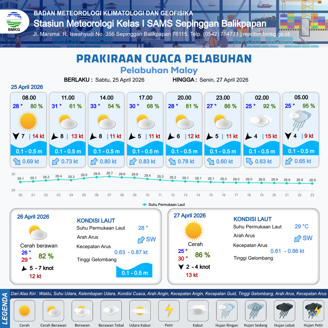 24 Apr 26, 08.00 8 jam kedepan | Timur 4 kt Gust Peningkatan kecepatan angin yang singkat dan tiba-tiba : 9 kt | 0.2 m Tenang | Barat Daya 0.7 Knot | 10 km | 30 °C | 72 % | -0.15 m | |
