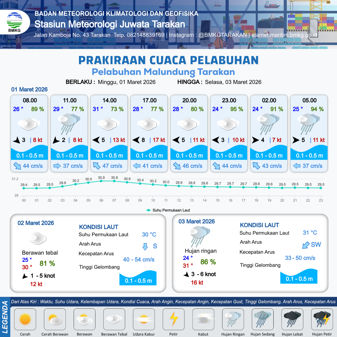 1 Mar 26, 22.00 4 jam kedepan | Berawan Tebal | Barat 5 kt Gust Peningkatan kecepatan angin yang singkat dan tiba-tiba : 10 kt | | | 10 km | 25 °C | 94 % | +0.58 m |