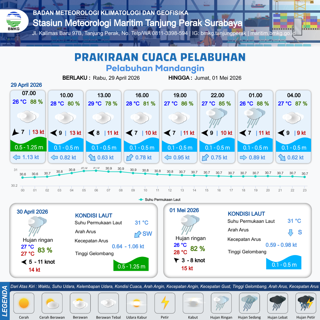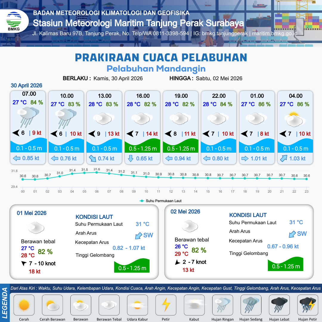 28 Apr 26, 21.00 4 jam kedepan | Berawan Tebal | Timur 8 kt Gust Peningkatan kecepatan angin yang singkat dan tiba-tiba : 9 kt | | | 10 km | 27 °C | 86 % | -1.07 m |