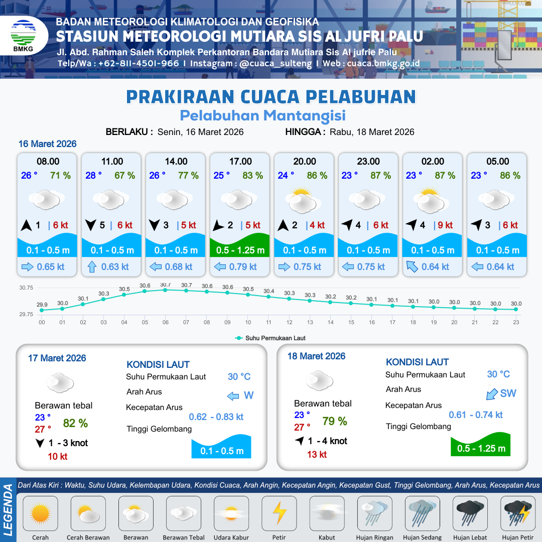 16 Mar 26, 15.00 2 jam kedepan | Barat Daya 4 kt Gust Peningkatan kecepatan angin yang singkat dan tiba-tiba : 6 kt | 0.4 m Tenang | Barat 0.8 Knot | 9 km | 23 °C | 87 % | -0.27 m | |