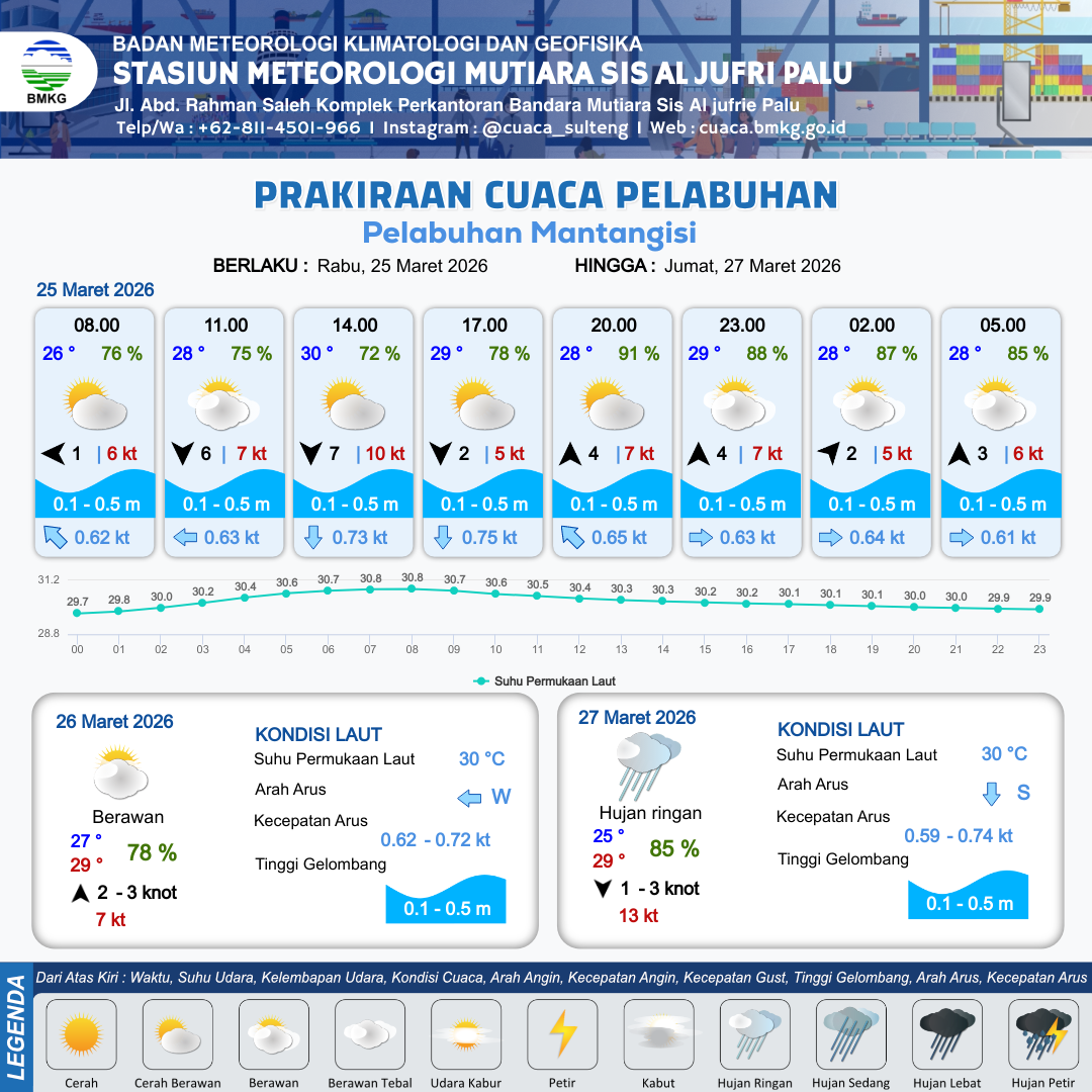 25 Mar 26, 06.00 3 jam kedepan | Utara 7 kt Gust Peningkatan kecepatan angin yang singkat dan tiba-tiba : 10 kt | 0.3 m Tenang | Selatan 0.7 Knot | 10 km | 30 °C | 72 % | -0.15 m | |