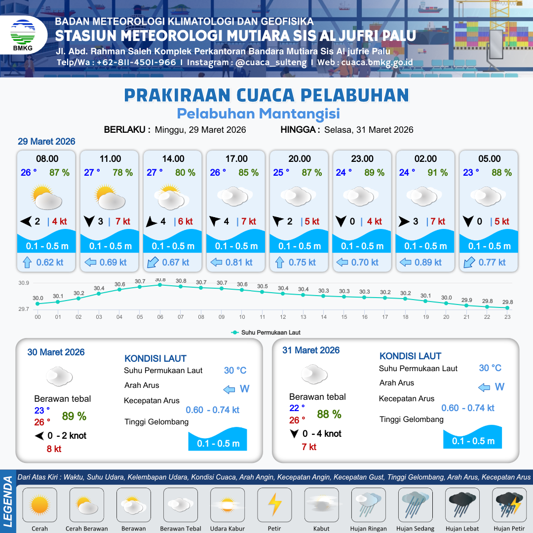29 Mar 26, 23.00 7 jam kedepan | Timur 2 kt Gust Peningkatan kecepatan angin yang singkat dan tiba-tiba : 5 kt | 0.2 m Tenang | Barat 0.7 Knot | 10 km | 24 °C | 92 % | -0.07 m |
