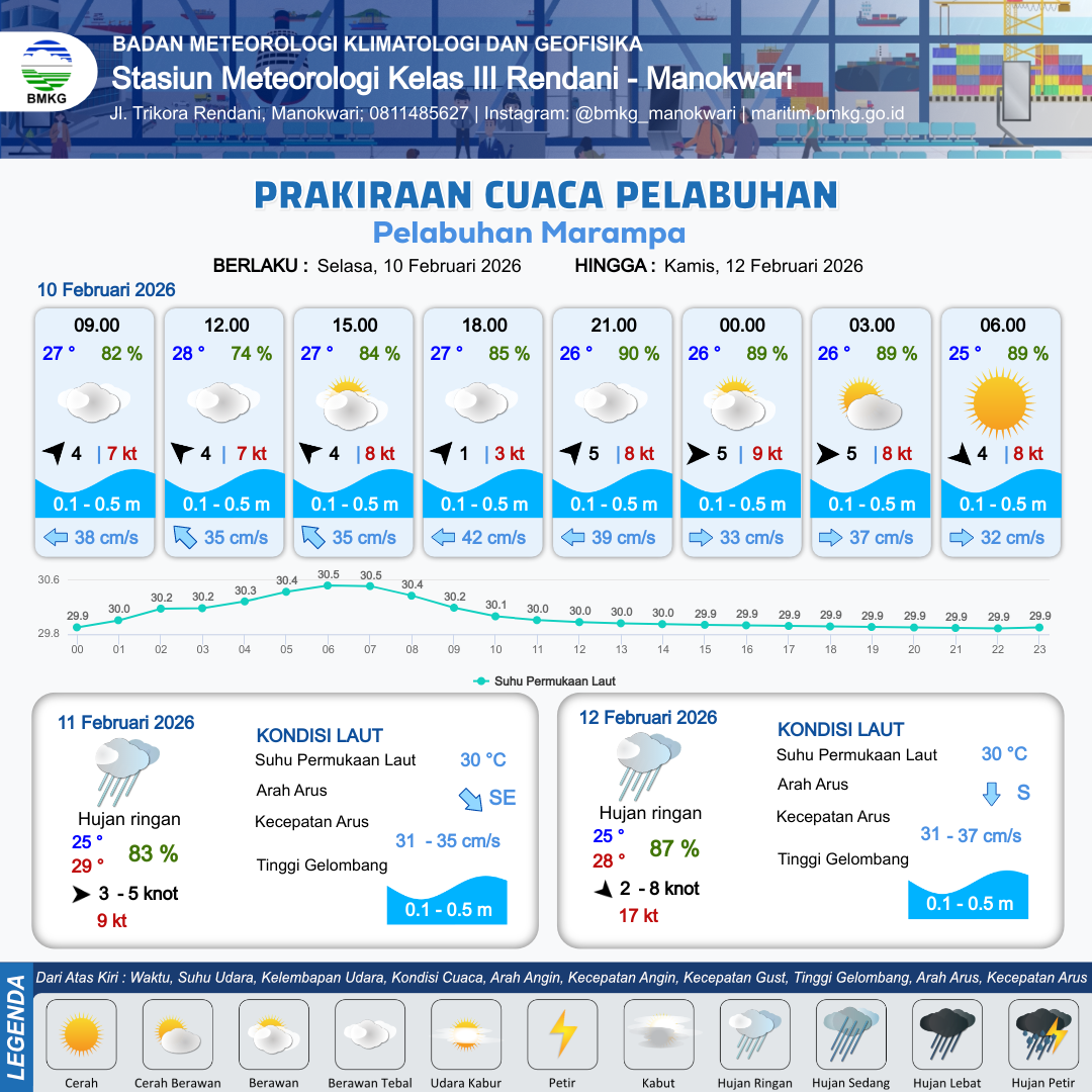 10 Feb 26, 23.00 5 jam kedepan | Cerah | Barat 3 kt Gust Peningkatan kecepatan angin yang singkat dan tiba-tiba : 7 kt | | | 10 km | 27 °C | 83 % | -0.05 m |