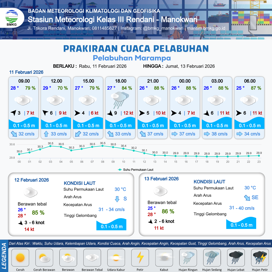 10 Feb 26, 08.00 10 jam yang lalu | Berawan Tebal | Barat Daya 1 kt Gust Peningkatan kecepatan angin yang singkat dan tiba-tiba : 3 kt | | | 7 km | 28 °C | 83 % | -0.15 m |