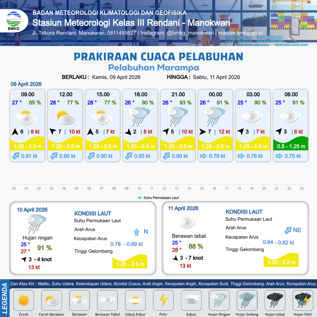 10 Apr 26, 09.00 11 jam kedepan | Selatan 4 kt Gust Peningkatan kecepatan angin yang singkat dan tiba-tiba : 7 kt | 0.7 m Rendah | Utara 0.7 Knot | 6 km | 26 °C | 92 % | +0.66 m | |