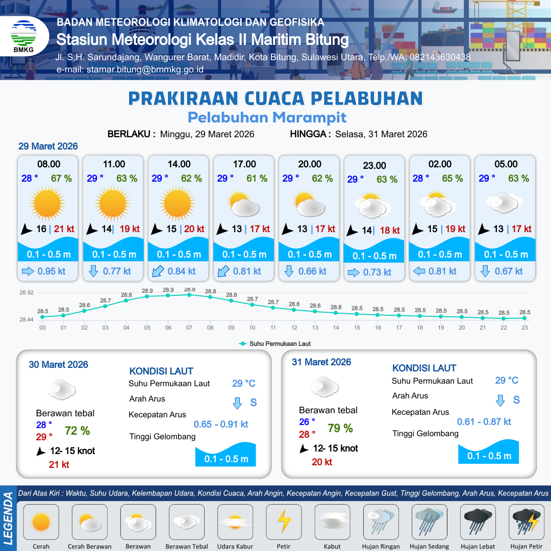 29 Mar 26, 14.00 2 jam kedepan | Timur Laut 14 kt Gust Peningkatan kecepatan angin yang singkat dan tiba-tiba : 18 kt | 0.1 m Tenang | Timur 0.7 Knot | 10 km | 29 °C | 64 % | -0.92 m | |