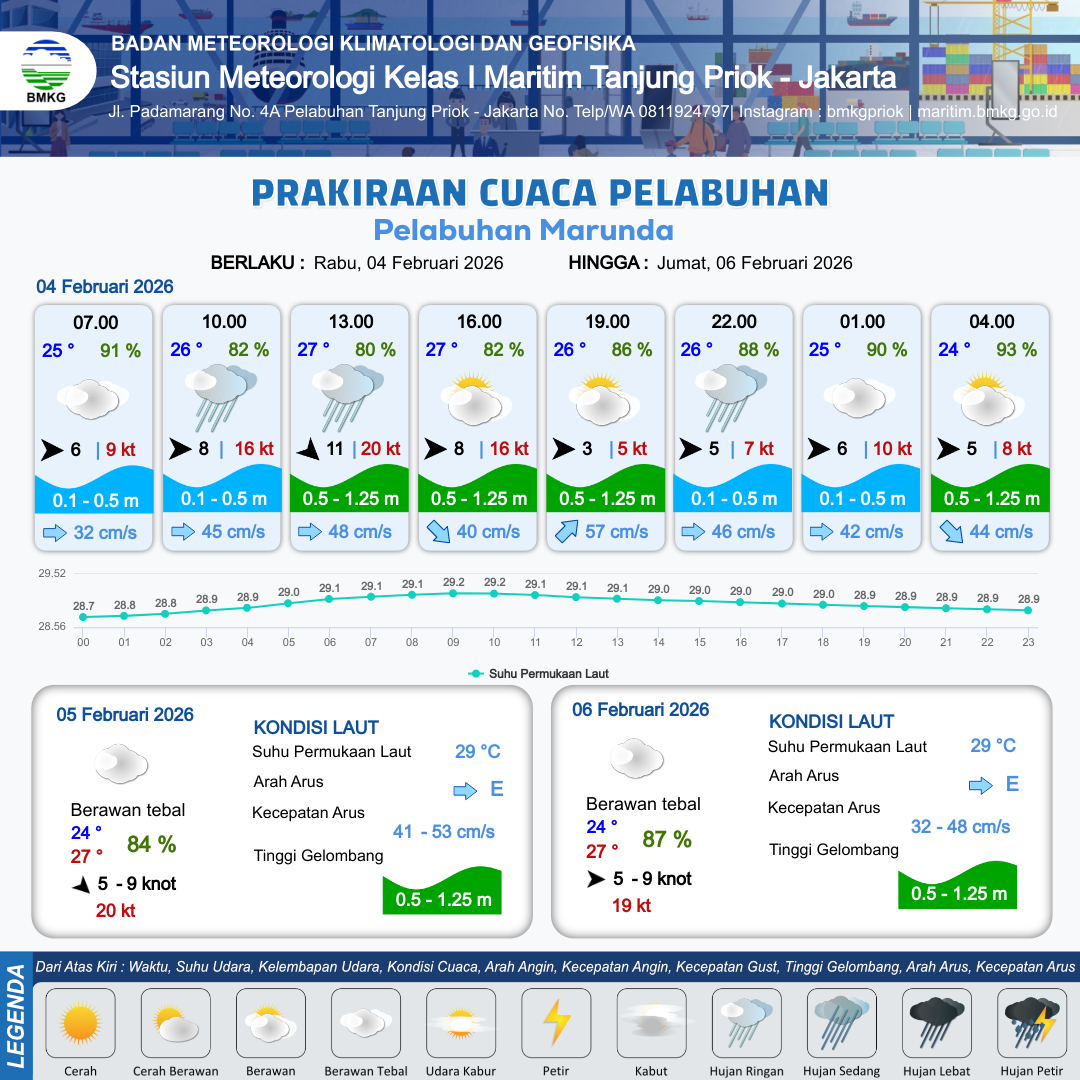4 Feb 26, 23.00 3 jam kedepan | Berawan | Barat 6 kt Gust Peningkatan kecepatan angin yang singkat dan tiba-tiba : 10 kt | | | 10 km | 24 °C | 90 % | +0.16 m |