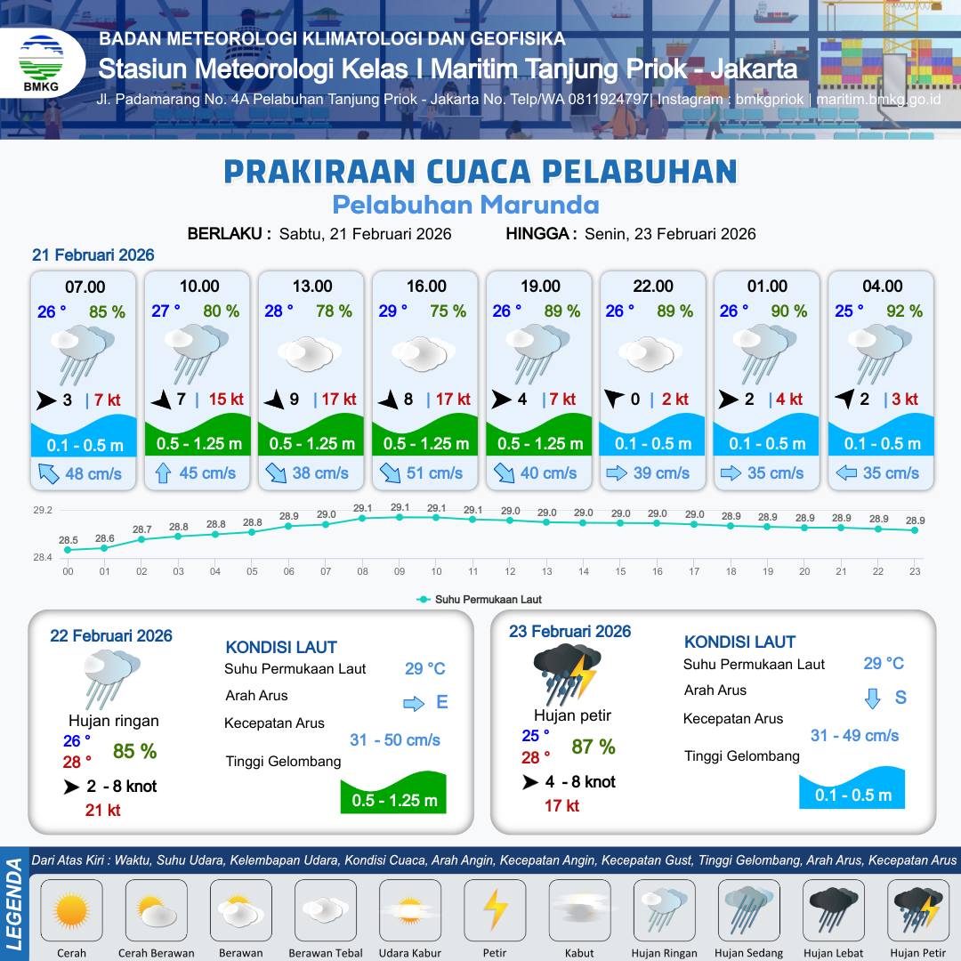 21 Feb 26, 21.00 4 jam kedepan | Hujan Ringan | Barat Daya 2 kt Gust Peningkatan kecepatan angin yang singkat dan tiba-tiba : 3 kt | | | 10 km | 25 °C | 92 % | +0.27 m |