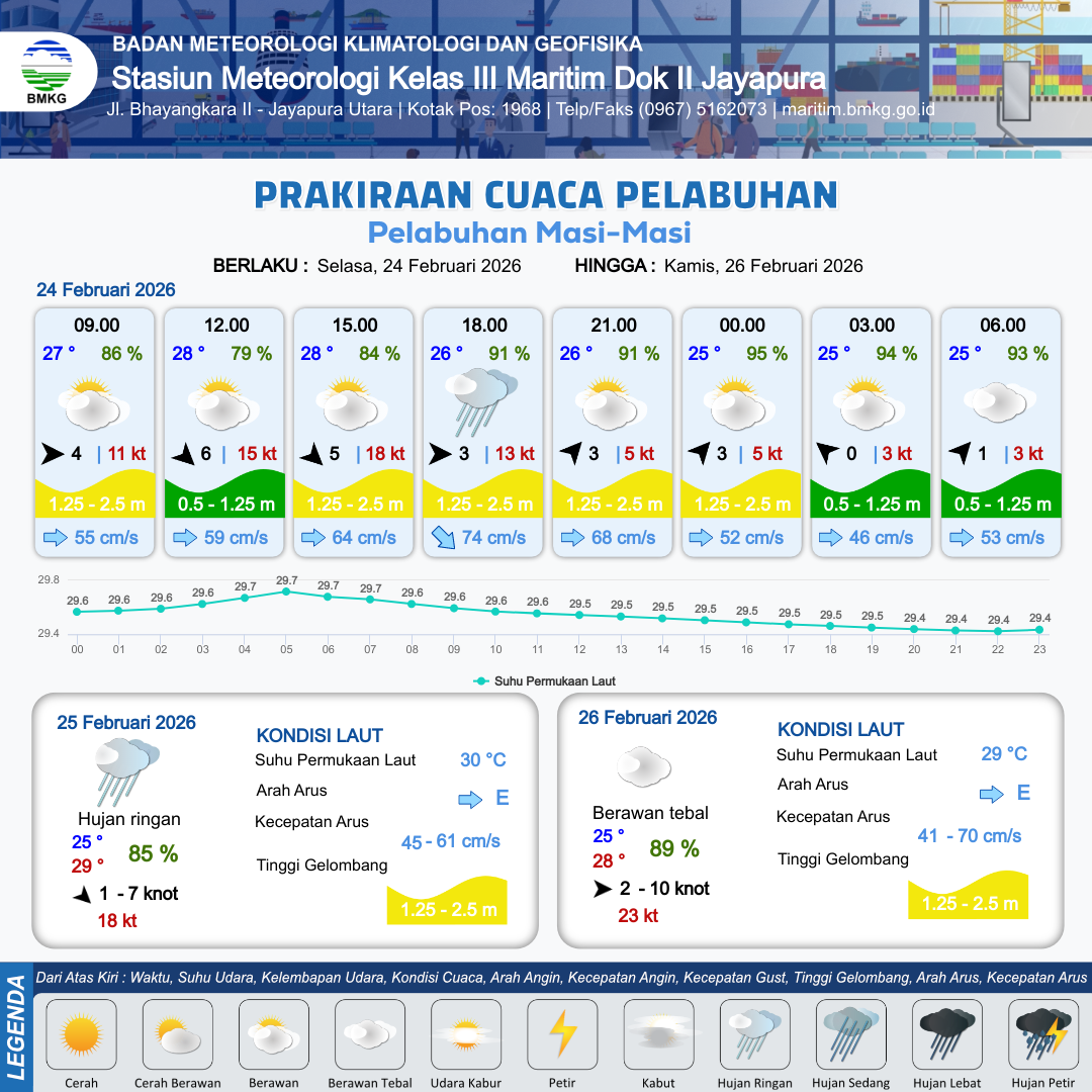 24 Feb 26, 20.00 12 jam kedepan | Barat Daya 1 kt Gust Peningkatan kecepatan angin yang singkat dan tiba-tiba : 3 kt | 1.2 m Rendah | Timur 50.0 cm/s | 10 km | 25 °C | 94 % | -0.14 m | |
