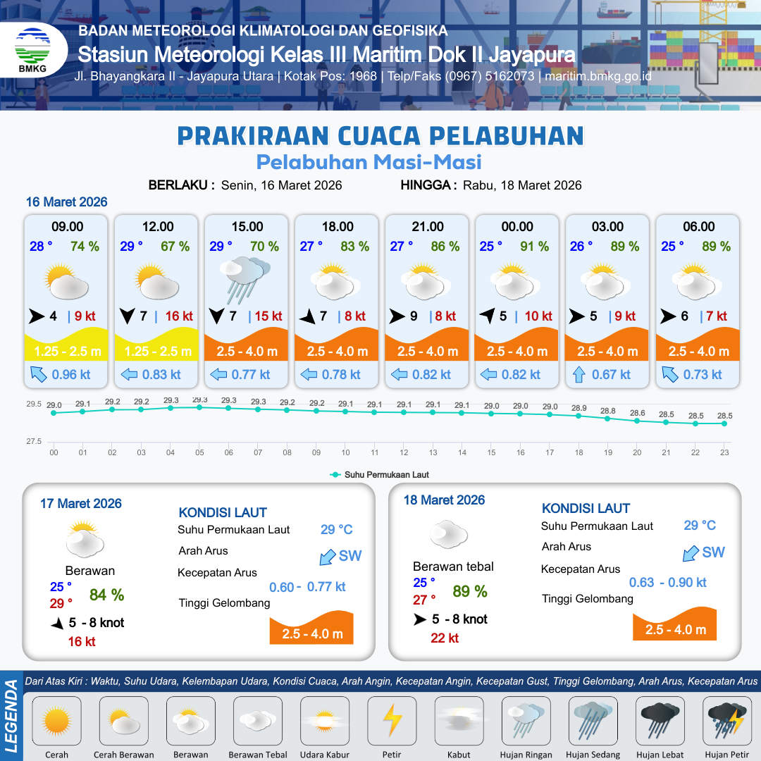 16 Mar 26, 23.00 3 jam kedepan | Berawan | Barat Daya 5 kt Gust Peningkatan kecepatan angin yang singkat dan tiba-tiba : 8 kt | | | 10 km | 27 °C | 79 % | +0.23 m |