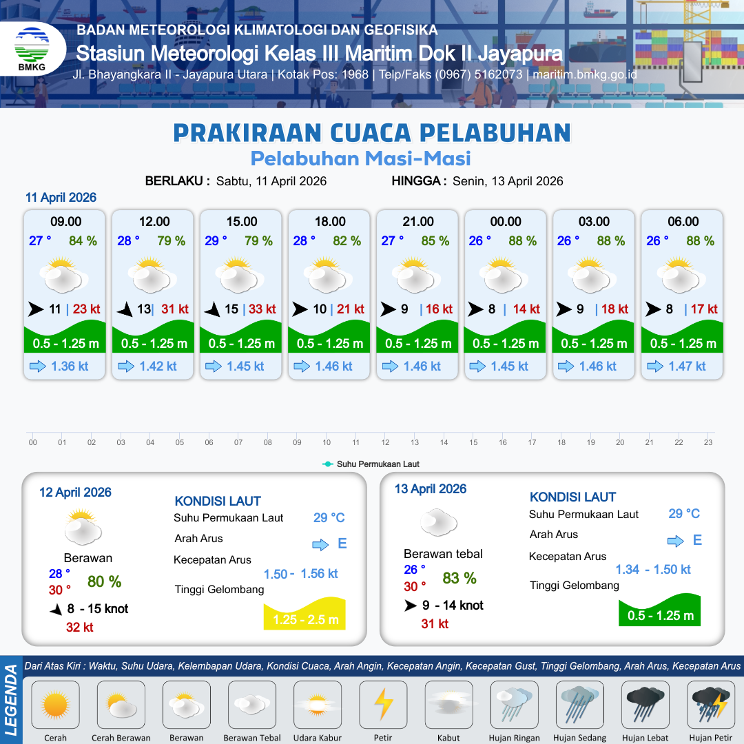 11 Apr 26, 13.00 6 jam kedepan | Barat 9 kt Gust Peningkatan kecepatan angin yang singkat dan tiba-tiba : 17 kt | 1.1 m Rendah | Timur 1.5 Knot | 10 km | 27 °C | 87 % | +0.61 m | |