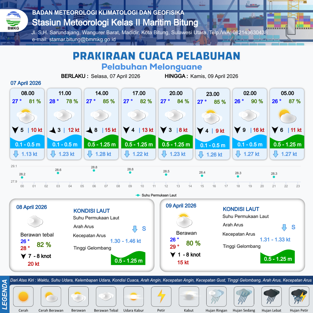 7 Apr 26, 09.00 11 jam kedepan | Utara 5 kt Gust Peningkatan kecepatan angin yang singkat dan tiba-tiba : 10 kt | 0.6 m Rendah | Selatan 1.2 Knot | 10 km | 28 °C | 76 % | +0.55 m | |