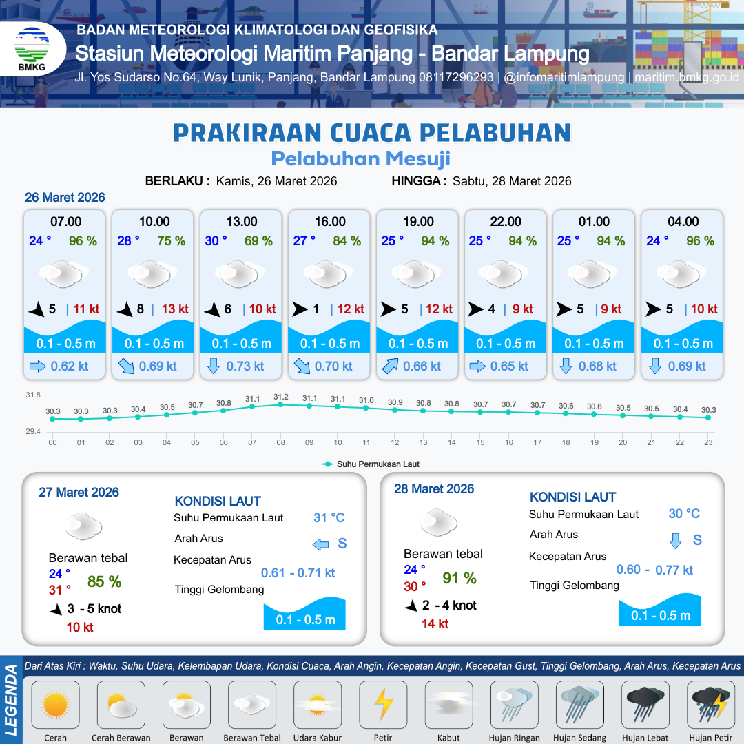 26 Mar 26, 11.00 10 jam kedepan | Barat 5 kt Gust Peningkatan kecepatan angin yang singkat dan tiba-tiba : 12 kt | 0.6 m Rendah | Timur 1.1 Knot | 10 km | 26 °C | 92 % | -0.18 m | |