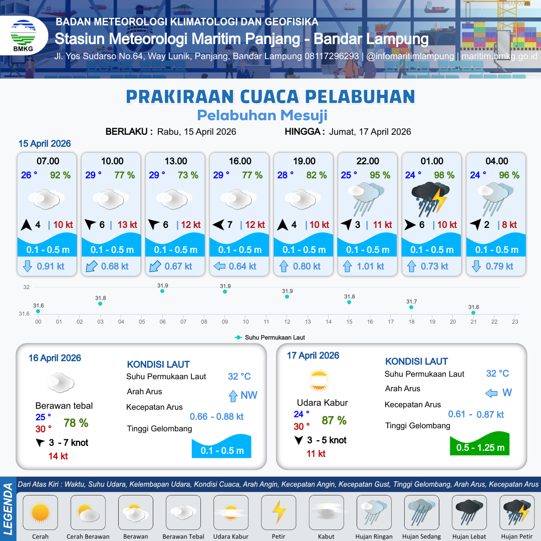 14 Apr 26, 00.00 19 jam yang lalu | Hujan Ringan | Barat 6 kt Gust Peningkatan kecepatan angin yang singkat dan tiba-tiba : 10 kt | | | 5 km | 25 °C | 96 % | +0.65 m |