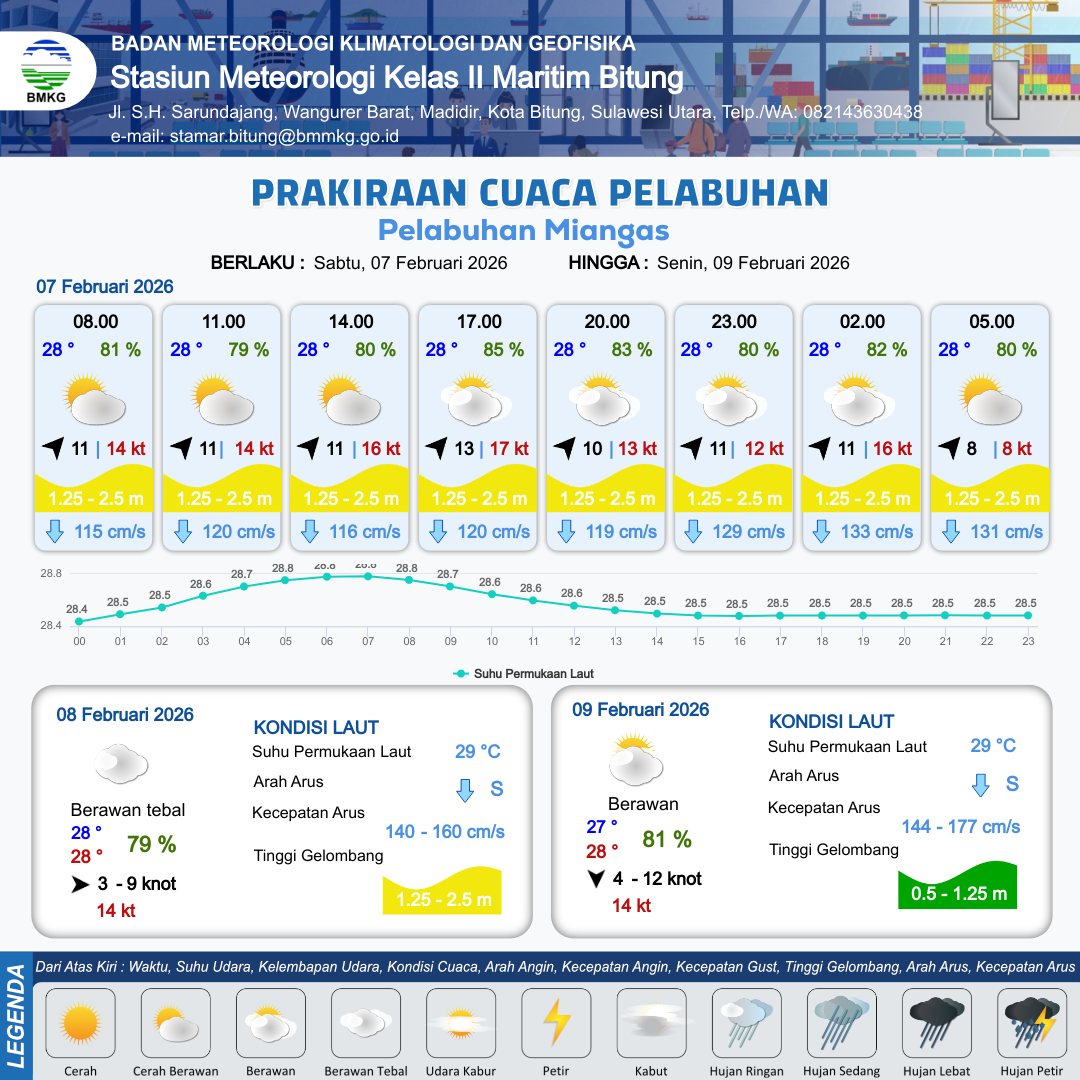 7 Feb 26, 23.00 5 jam kedepan | Cerah Berawan | Barat 9 kt Gust Peningkatan kecepatan angin yang singkat dan tiba-tiba : 12 kt | | | 10 km | 28 °C | 79 % | +0.01 m |