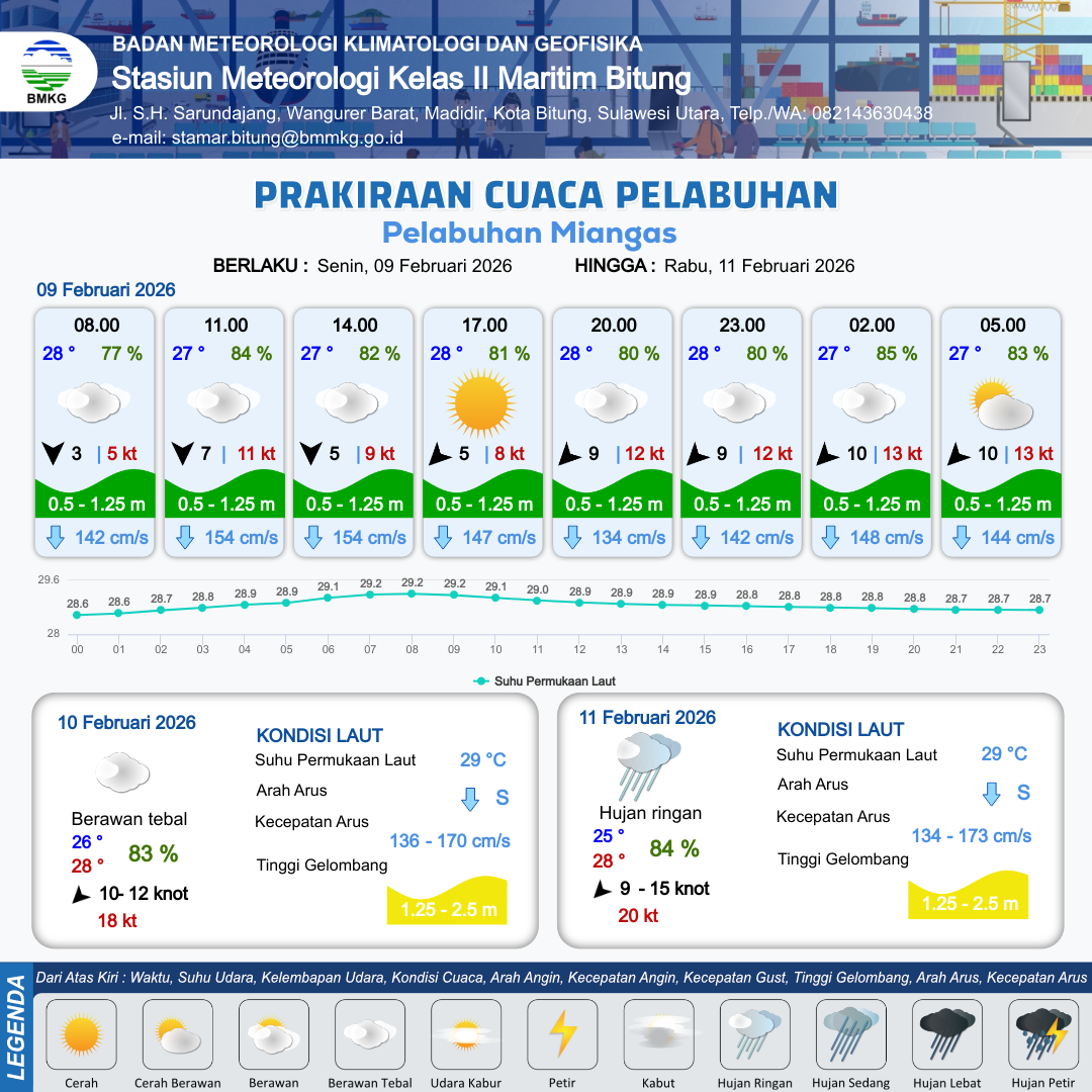 9 Feb 26, 09.00 2 jam kedepan | Timur Laut 5 kt Gust Peningkatan kecepatan angin yang singkat dan tiba-tiba : 8 kt | 0.9 m Rendah | Selatan 147.0 cm/s | 9 km | 28 °C | 81 % | -0.47 m | |