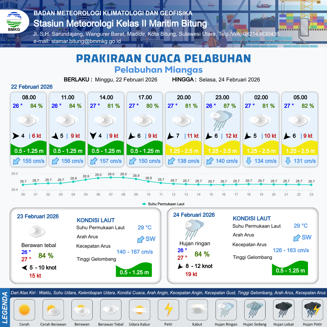 22 Feb 26, 23.00 9 jam kedepan | Timur 5 kt Gust Peningkatan kecepatan angin yang singkat dan tiba-tiba : 9 kt | 1.2 m Rendah | Selatan 137.0 cm/s | 10 km | 27 °C | 81 % | +0.14 m |
