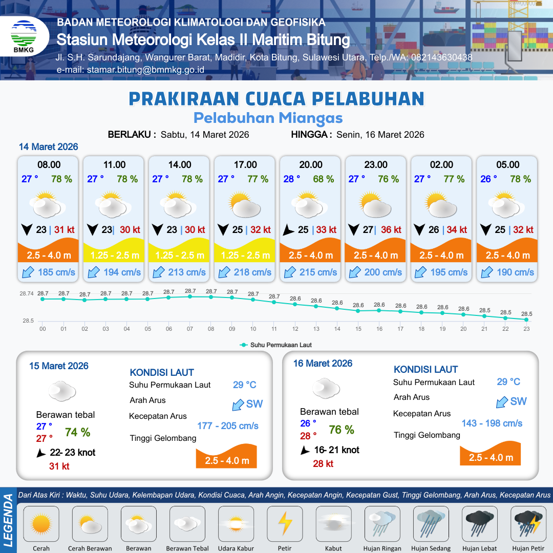 14 Mar 26, 18.00 3 jam kedepan | Utara 26 kt Gust Peningkatan kecepatan angin yang singkat dan tiba-tiba : 34 kt | 2.8 m Tinggi | Barat Daya 195.0 cm/s | 9 km | 27 °C | 77 % | -0.14 m | |