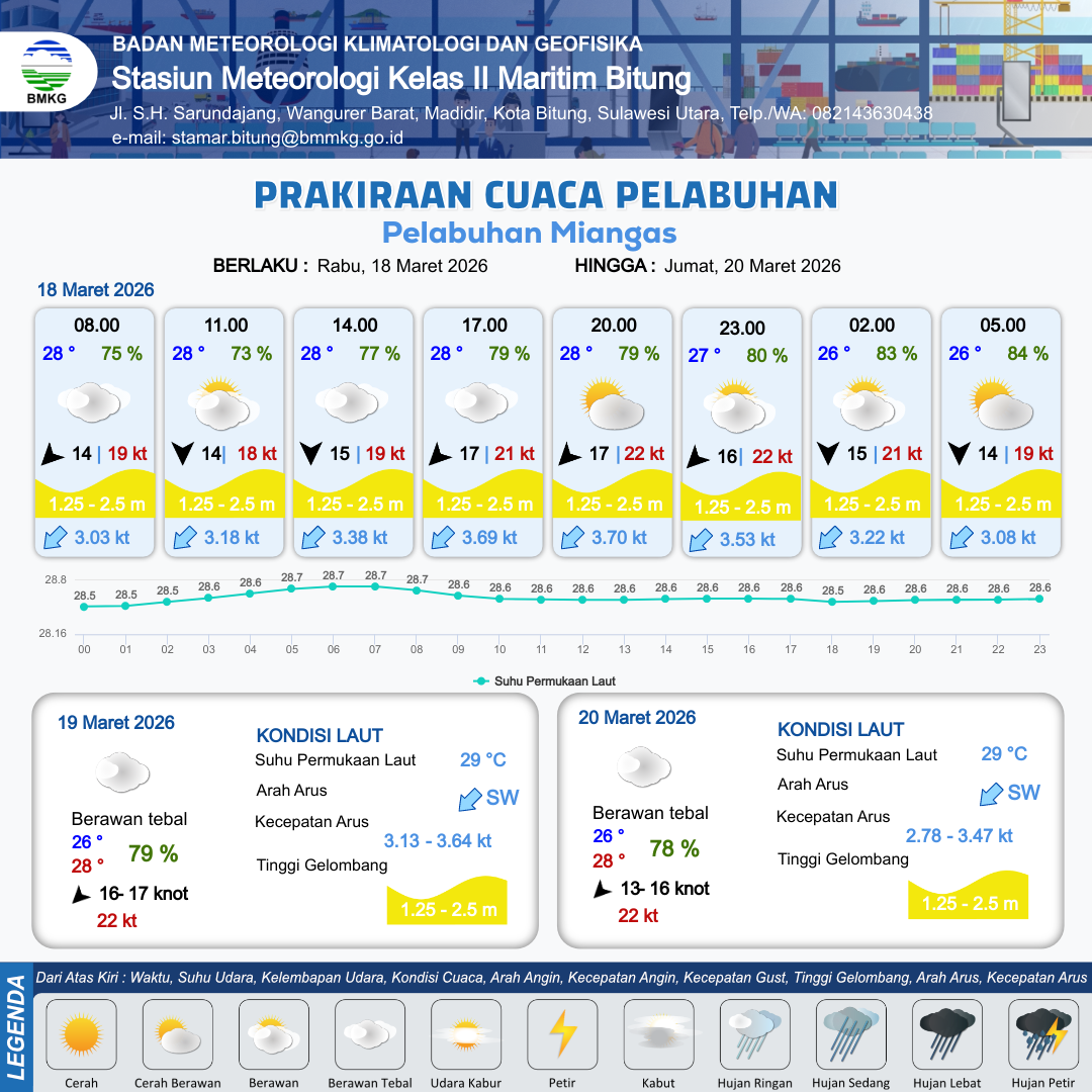 18 Mar 26, 23.00 3 jam kedepan | Berawan Tebal | Utara 17 kt Gust Peningkatan kecepatan angin yang singkat dan tiba-tiba : 19 kt | | | 10 km | 26 °C | 83 % | +0.51 m |