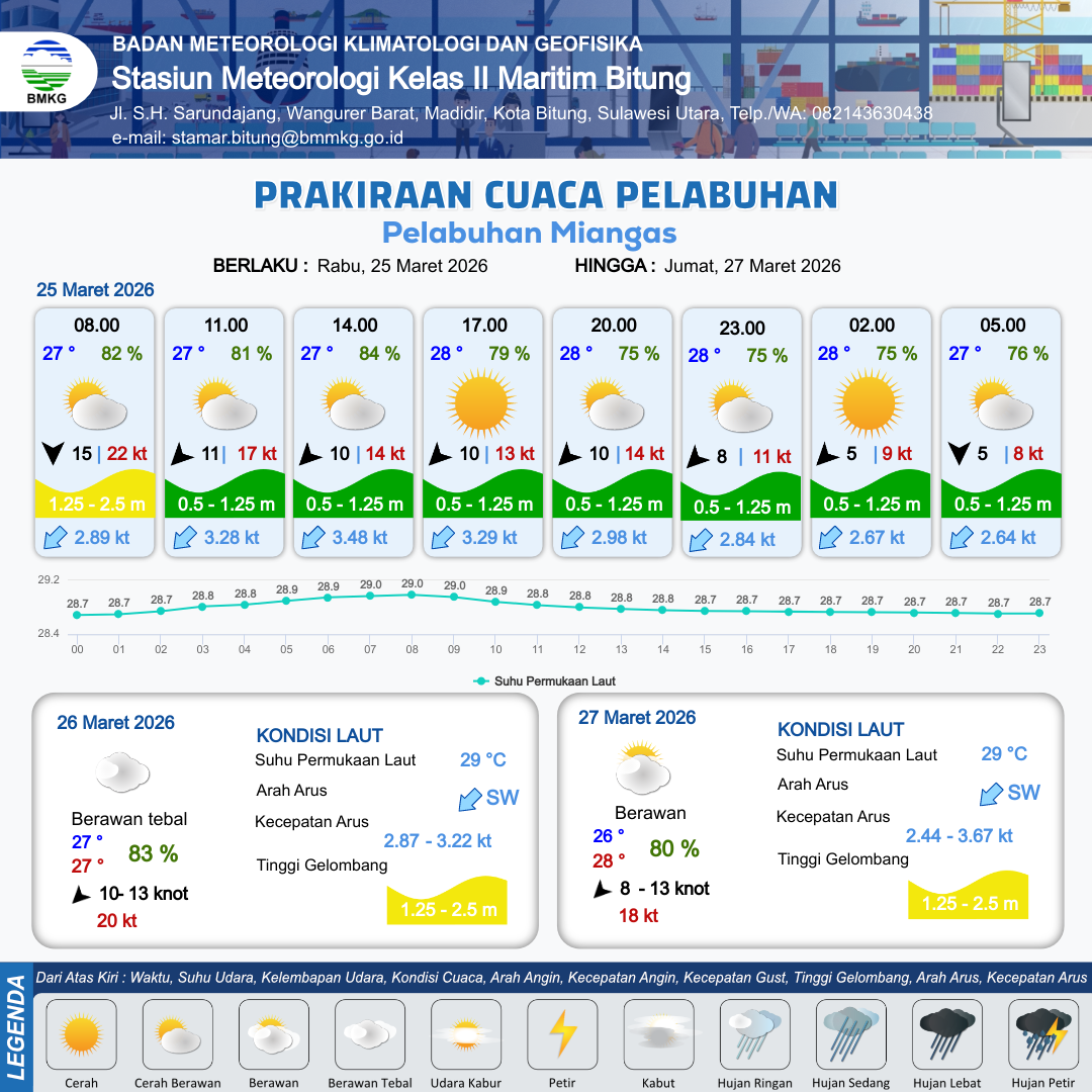 25 Mar 26, 04.00 14 jam yang lalu | Cerah Berawan | Timur Laut 11 kt Gust Peningkatan kecepatan angin yang singkat dan tiba-tiba : 16 kt | | | 9 km | 27 °C | 82 % | +0.10 m |