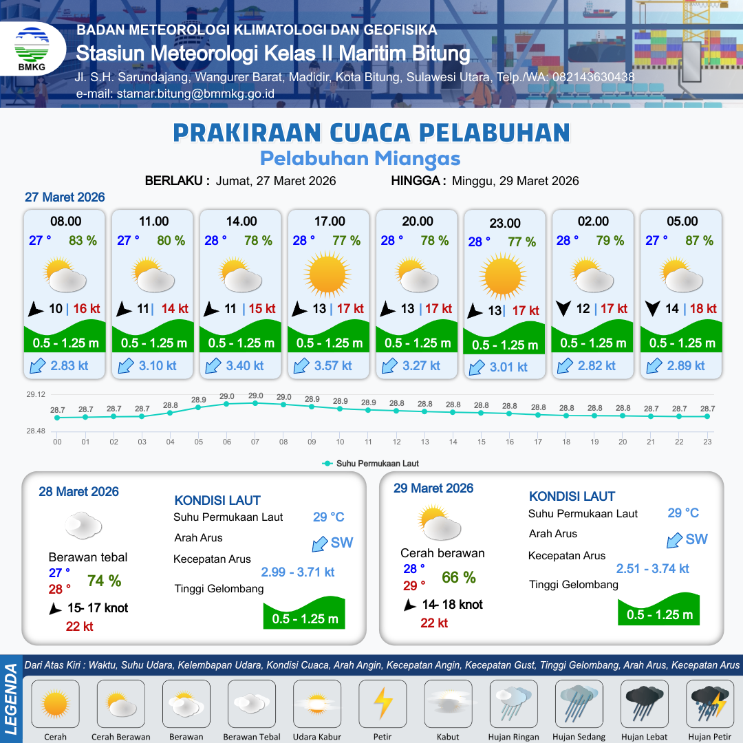 27 Mar 26, 23.00 24 jam kedepan | Utara 15 kt Gust Peningkatan kecepatan angin yang singkat dan tiba-tiba : 19 kt | 0.9 m Rendah | Barat Daya 2.9 Knot | 10 km | 27 °C | 83 % | -0.18 m |