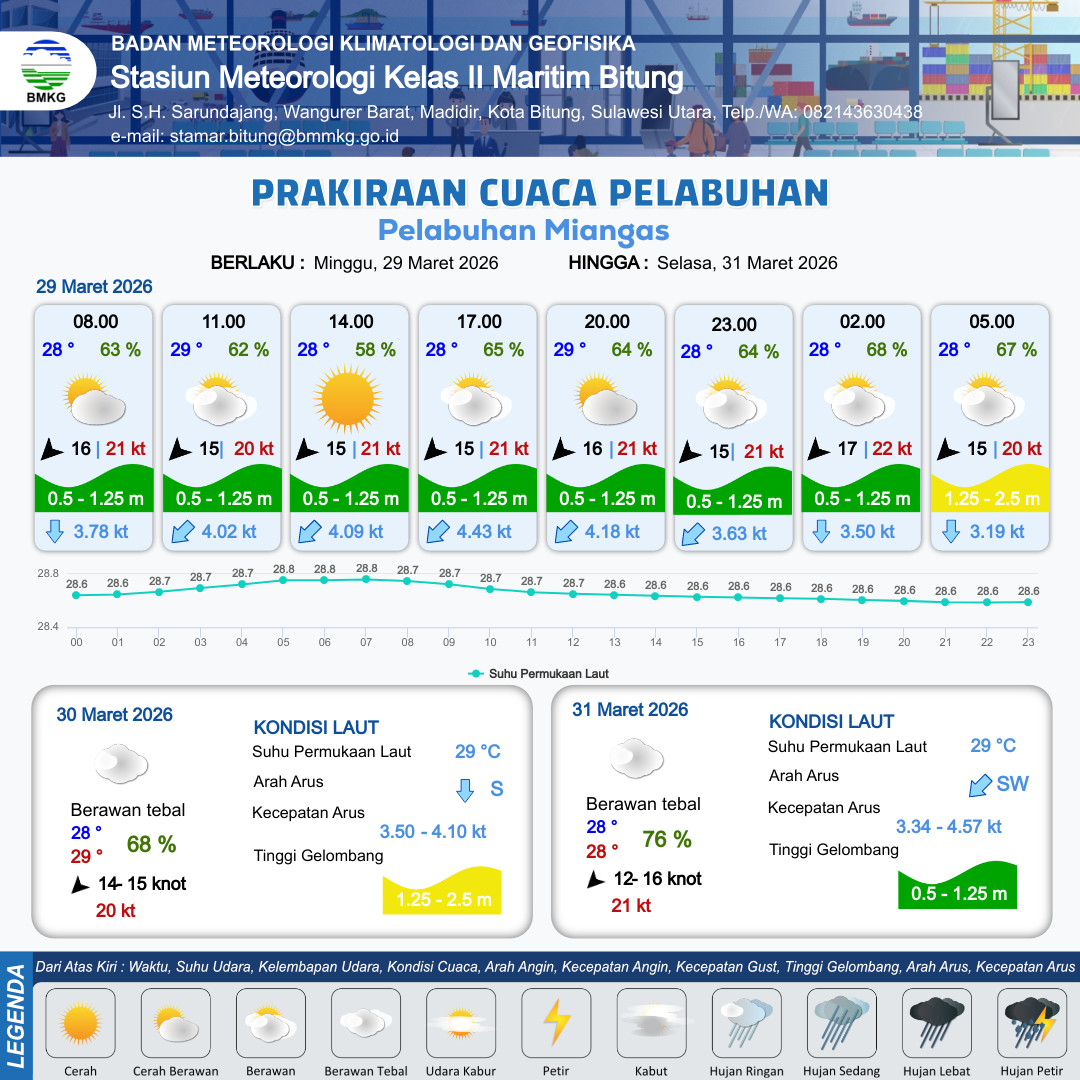 29 Mar 26, 23.00 12 jam kedepan | Timur Laut 14 kt Gust Peningkatan kecepatan angin yang singkat dan tiba-tiba : 18 kt | 1.3 m Sedang | Selatan 3.4 Knot | 10 km | 28 °C | 63 % | +0.04 m |