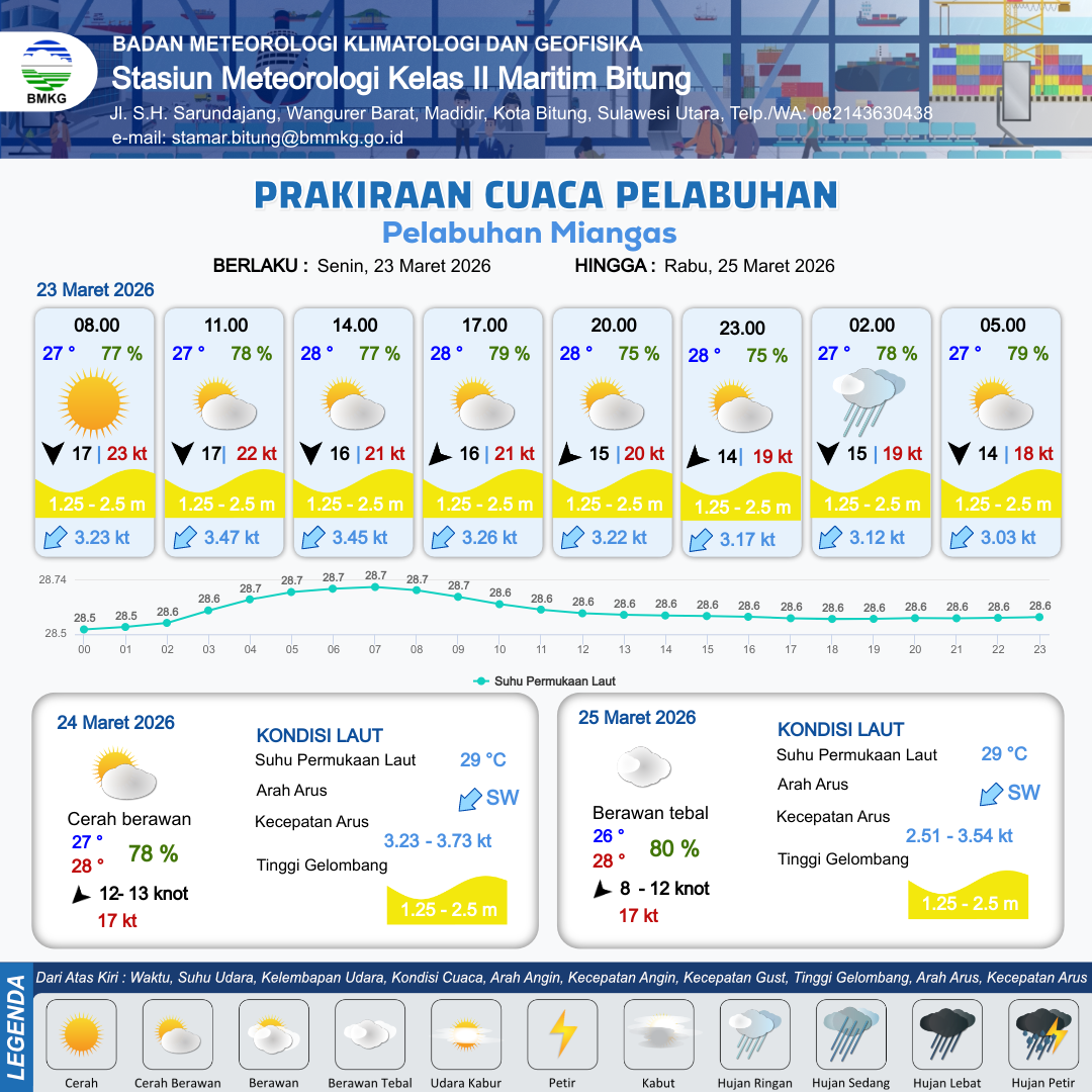 23 Mar 26, 23.00 5 jam kedepan | Cerah Berawan | Utara 13 kt Gust Peningkatan kecepatan angin yang singkat dan tiba-tiba : 17 kt | | | 10 km | 27 °C | 80 % | +0.36 m |